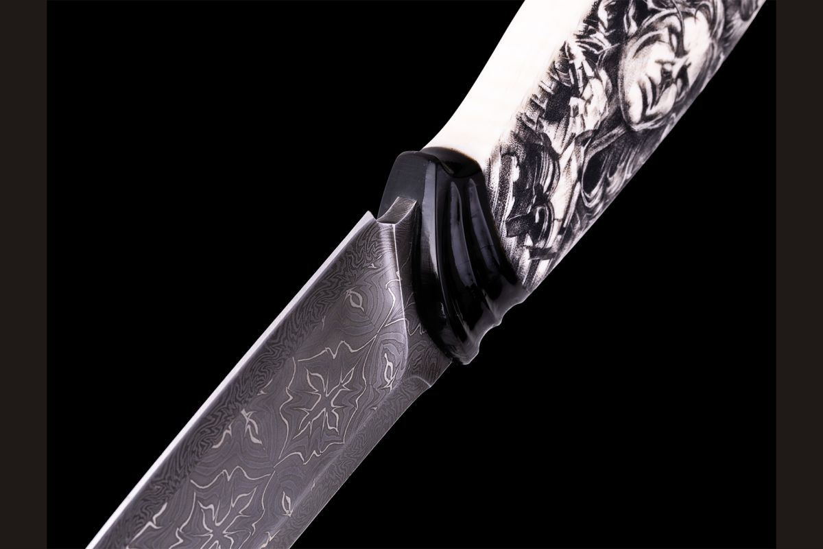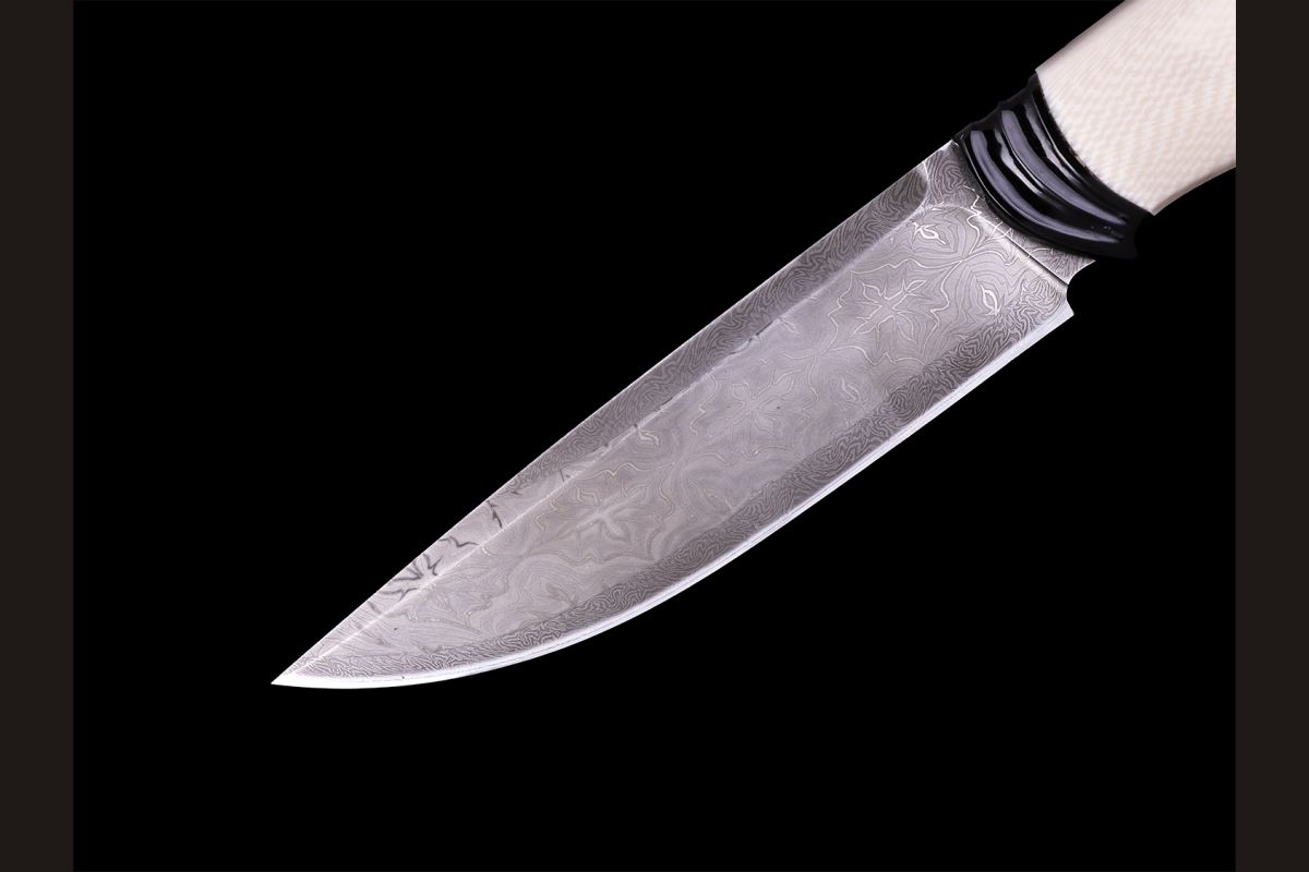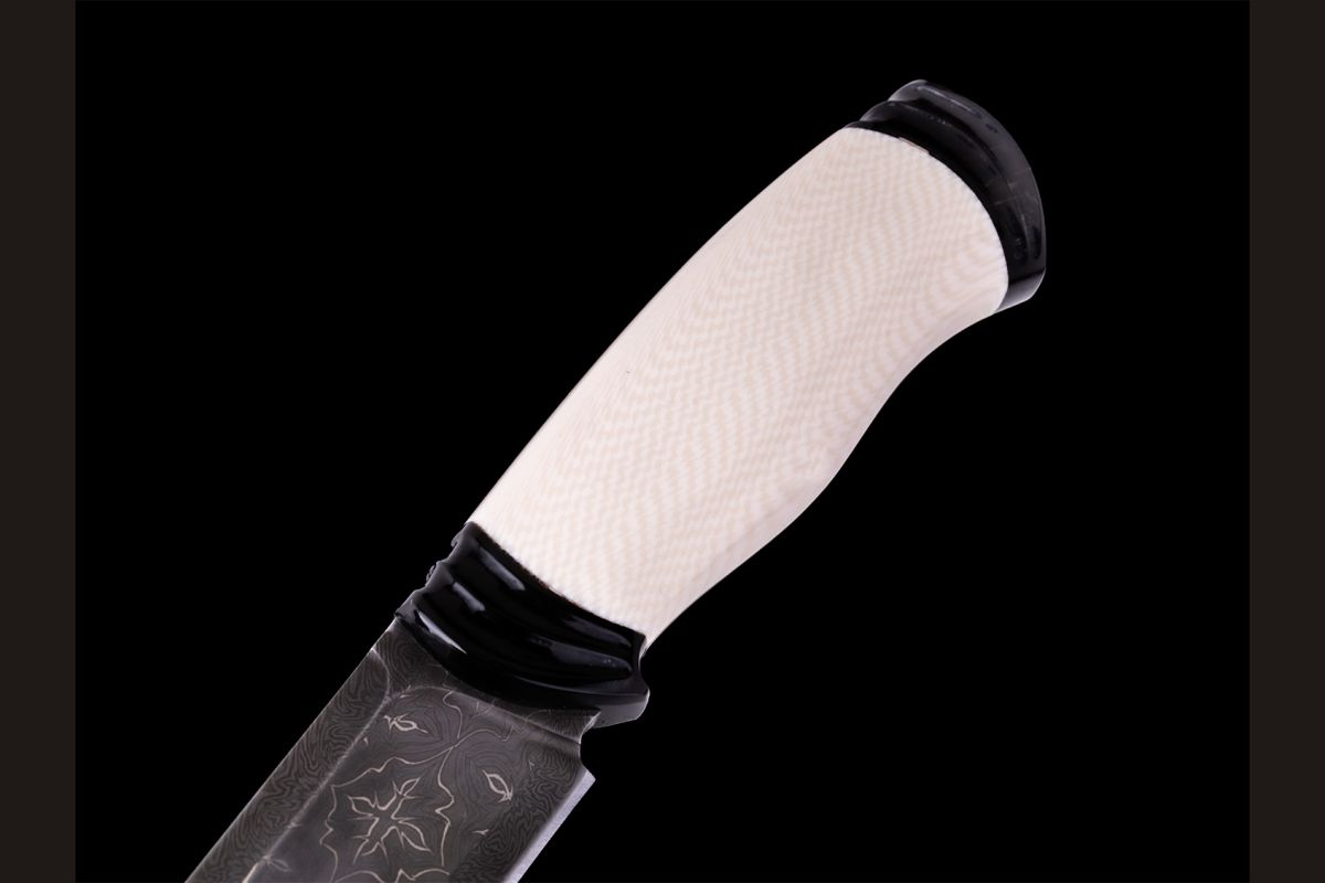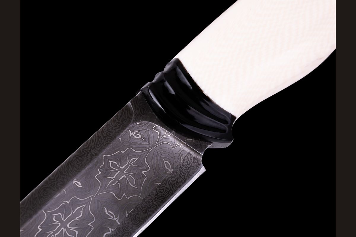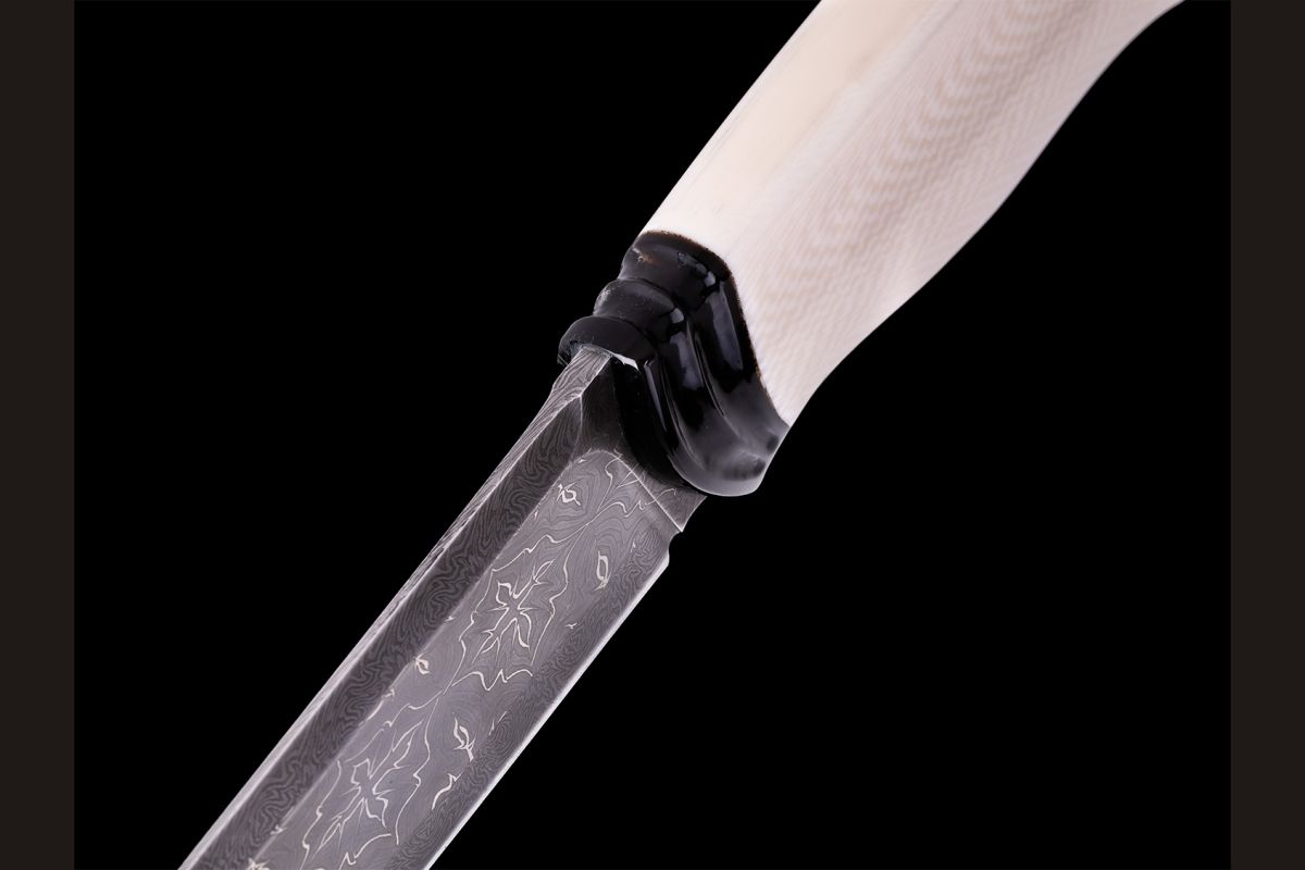 Авторский нож "Хранительница древ" (Сложный мозаичный дамаск с никелем, в режущей кромке 20000 слоёв, элфорин, рог буйвола, макумэ-ганэ)