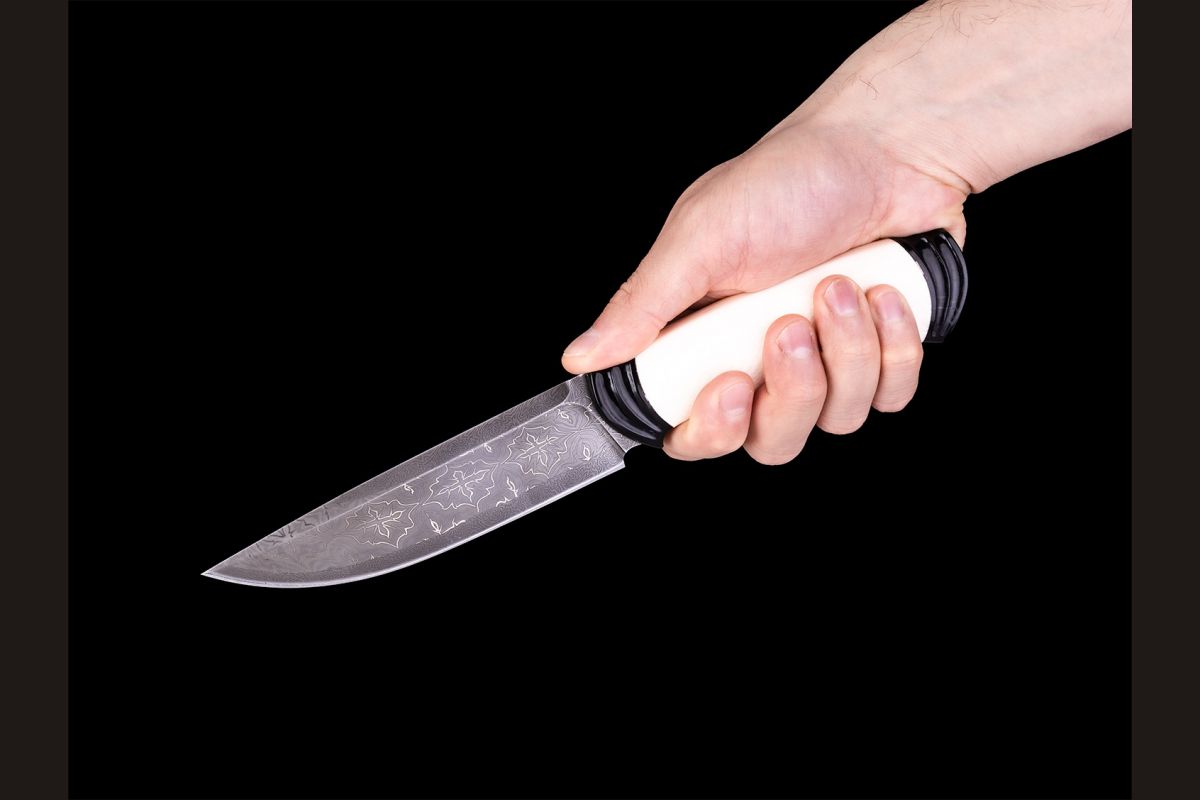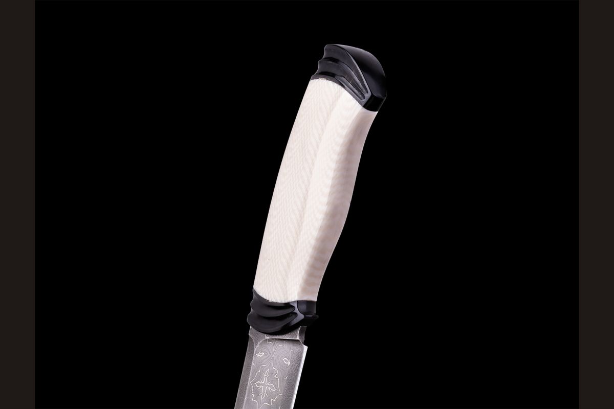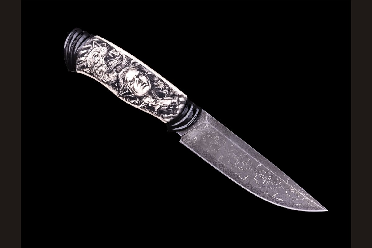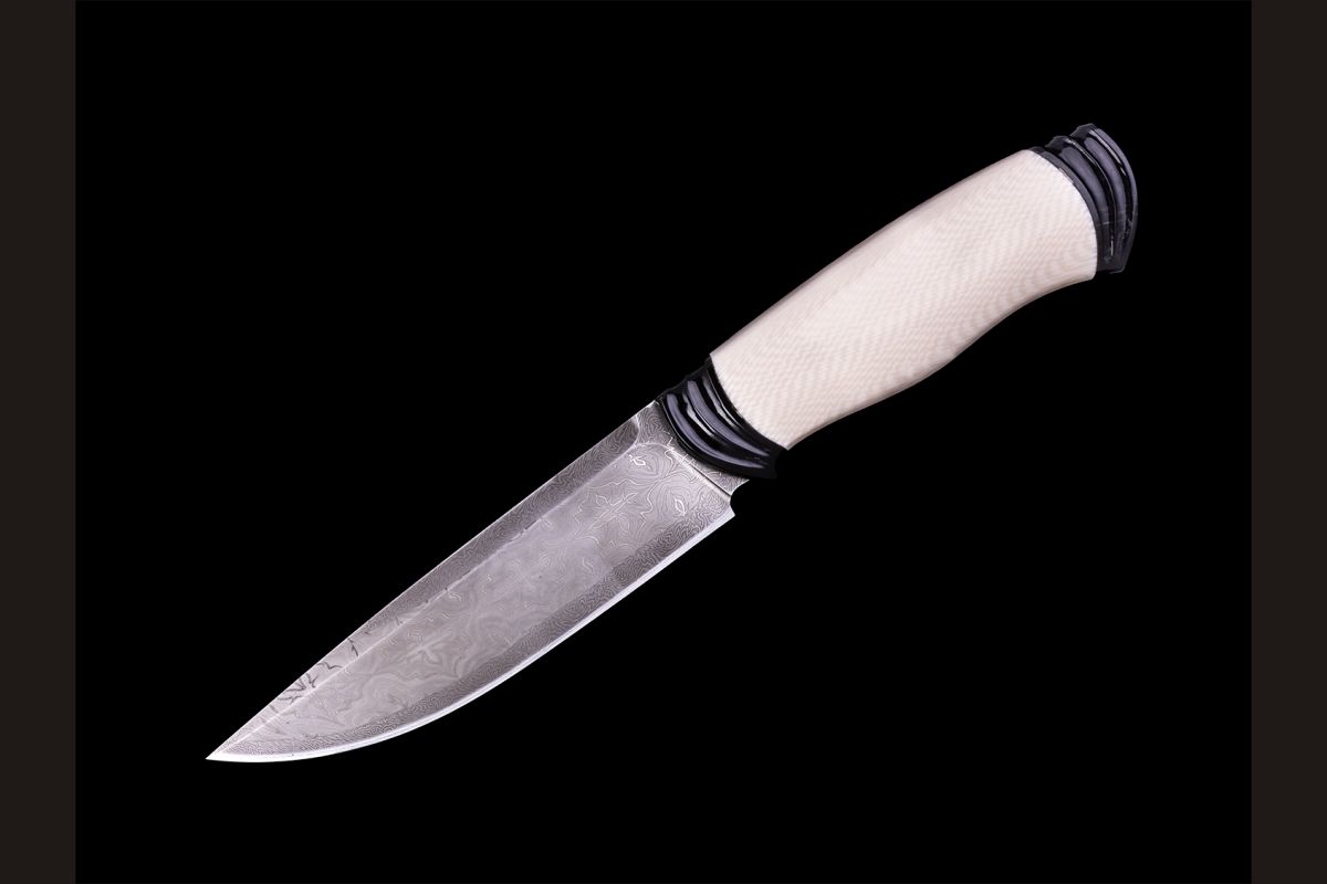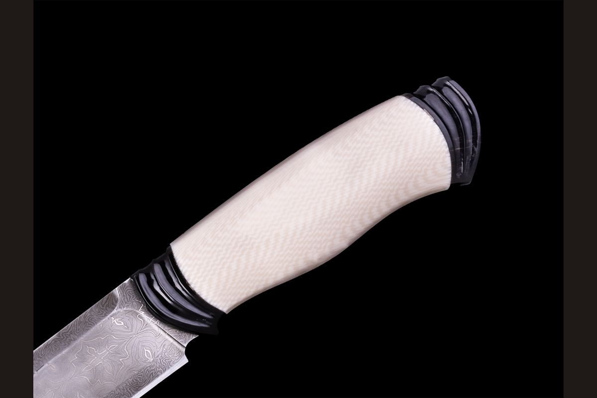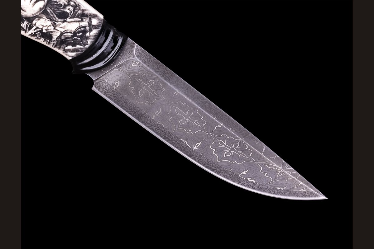 Авторский нож "Хранительница древ" (Сложный мозаичный дамаск с никелем, в режущей кромке 20000 слоёв, элфорин, рог буйвола, макумэ-ганэ)