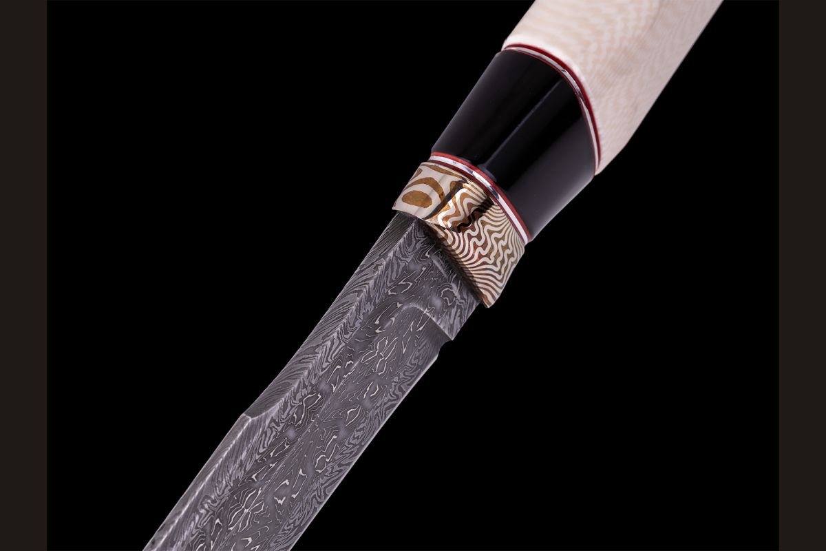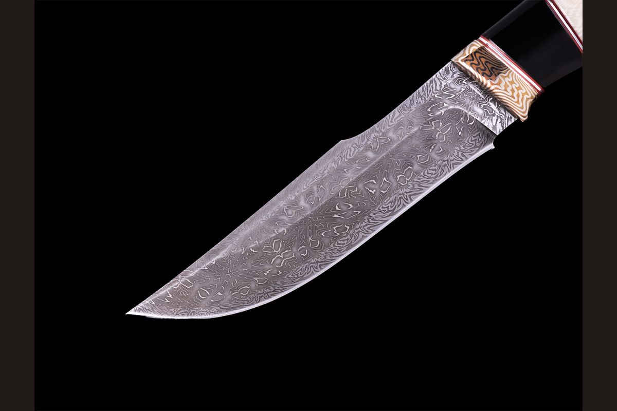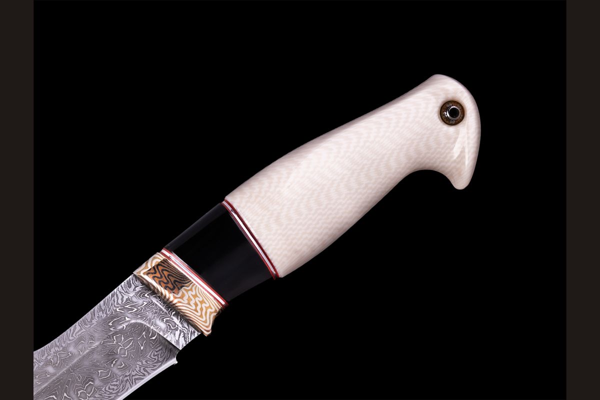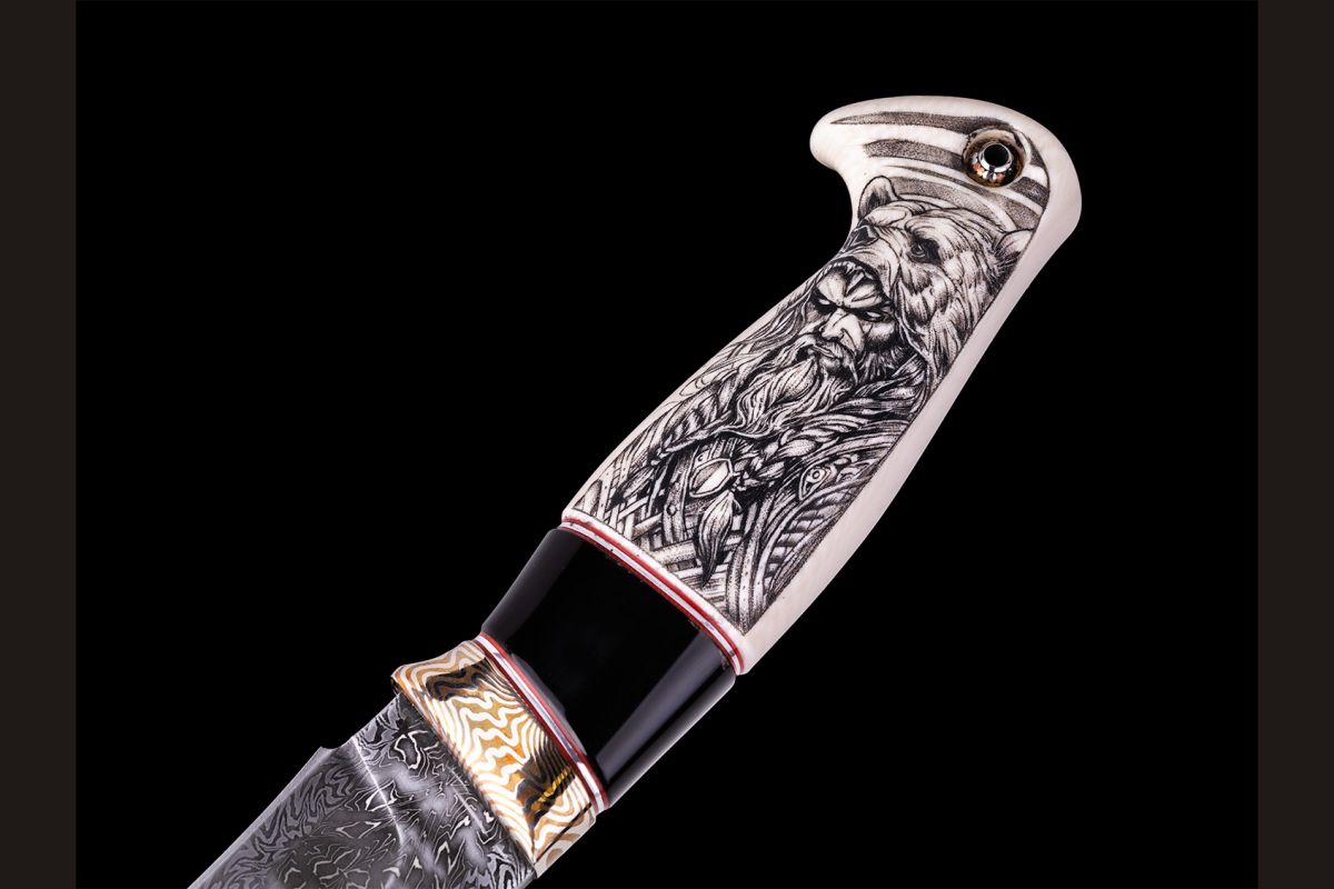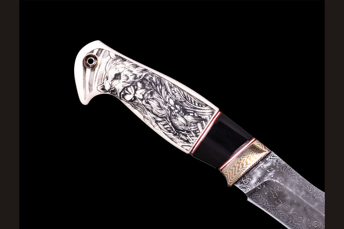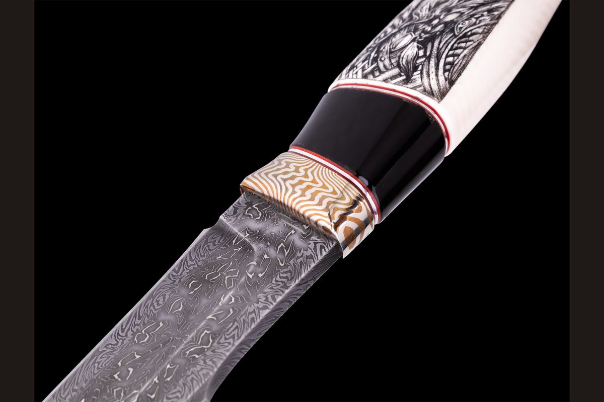 Авторский нож Берсерк (Мозаичный дамаск с никелем, в режущей кромке 20000 слоёв, клык моржа, элфорин, вставка - рог буйвола, макумэ-ганэ)