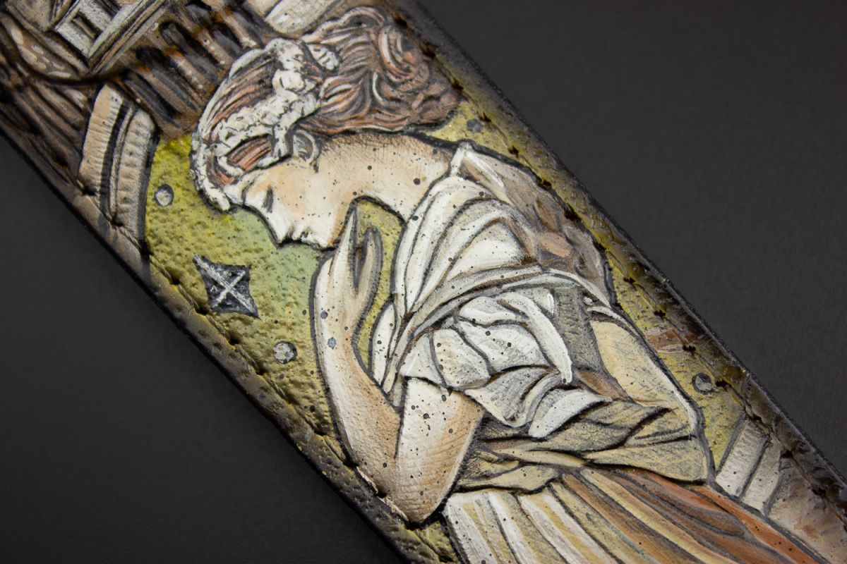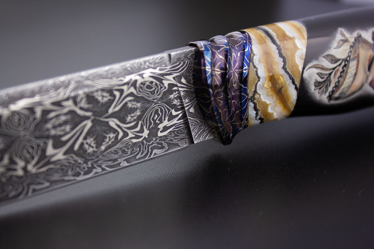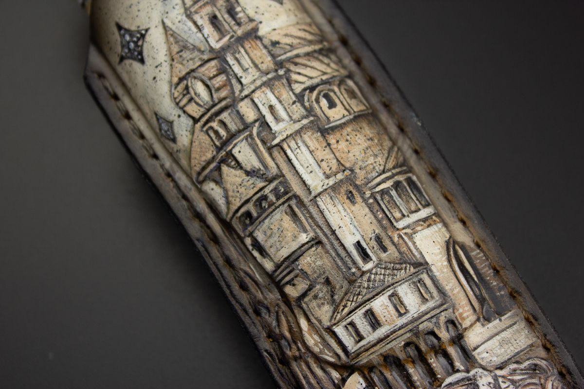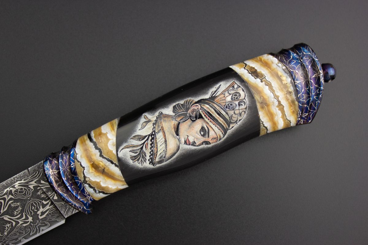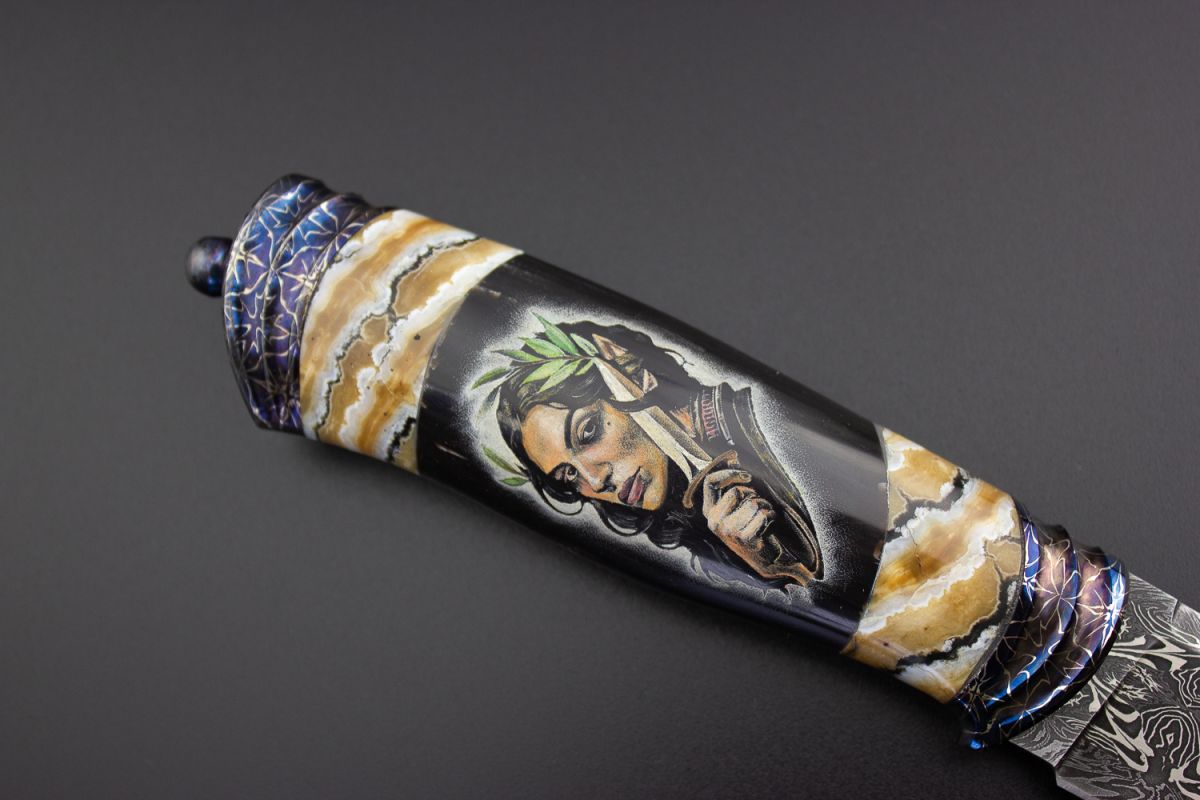 Авторский нож "Пиковая дама" (Мозаичный дамаск, рог буйвола, стабилизитрованный зуб мамонта, художественное оформление рукояти с 2-х сторон - скримшоу) формованные ножны
