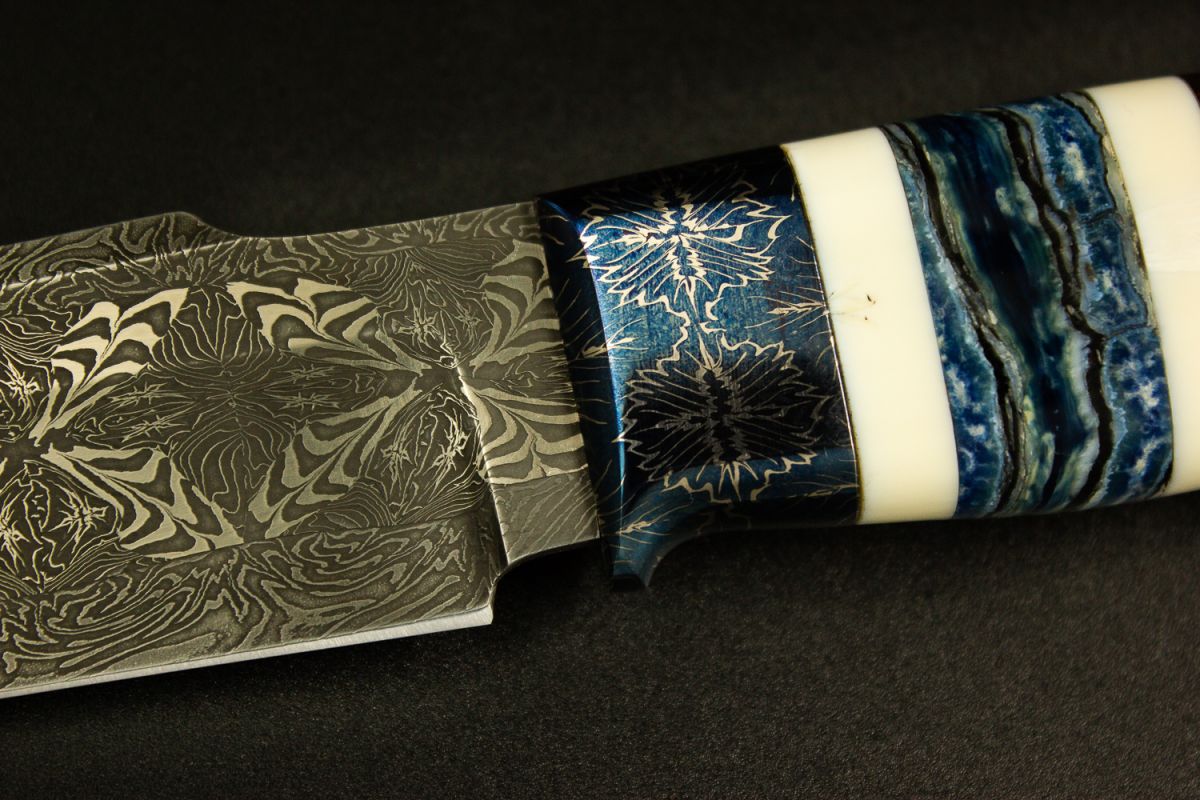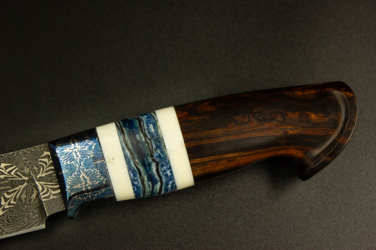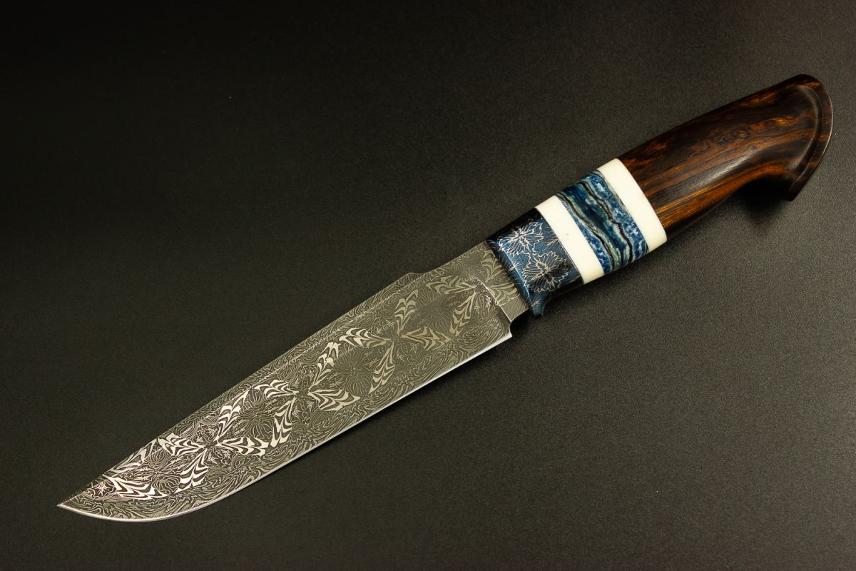 Авторский нож Тайга (Мозаичный дамаск, мозаичный больстер, вставка стабилизированный зуб мамонта, обкладки клык моржа, айронвуд, резная рукоять)