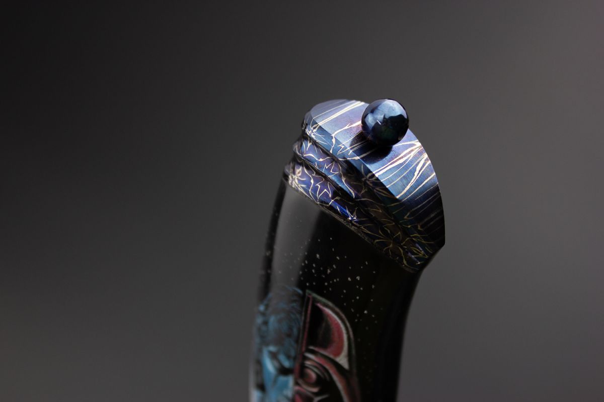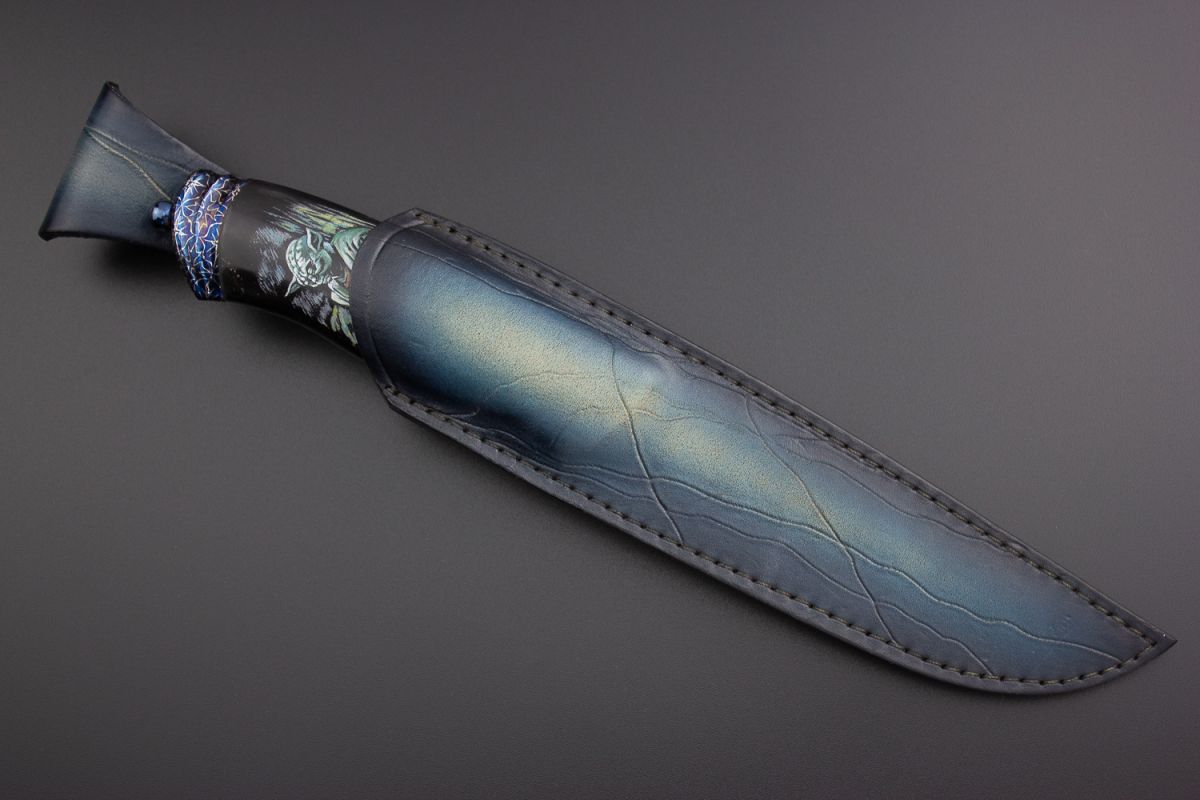 рог буйвола, больстер и навершие мозаичный дамаск, художественное оформление рукояти с 2-х сторон - скримшоу
