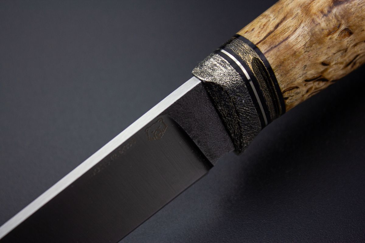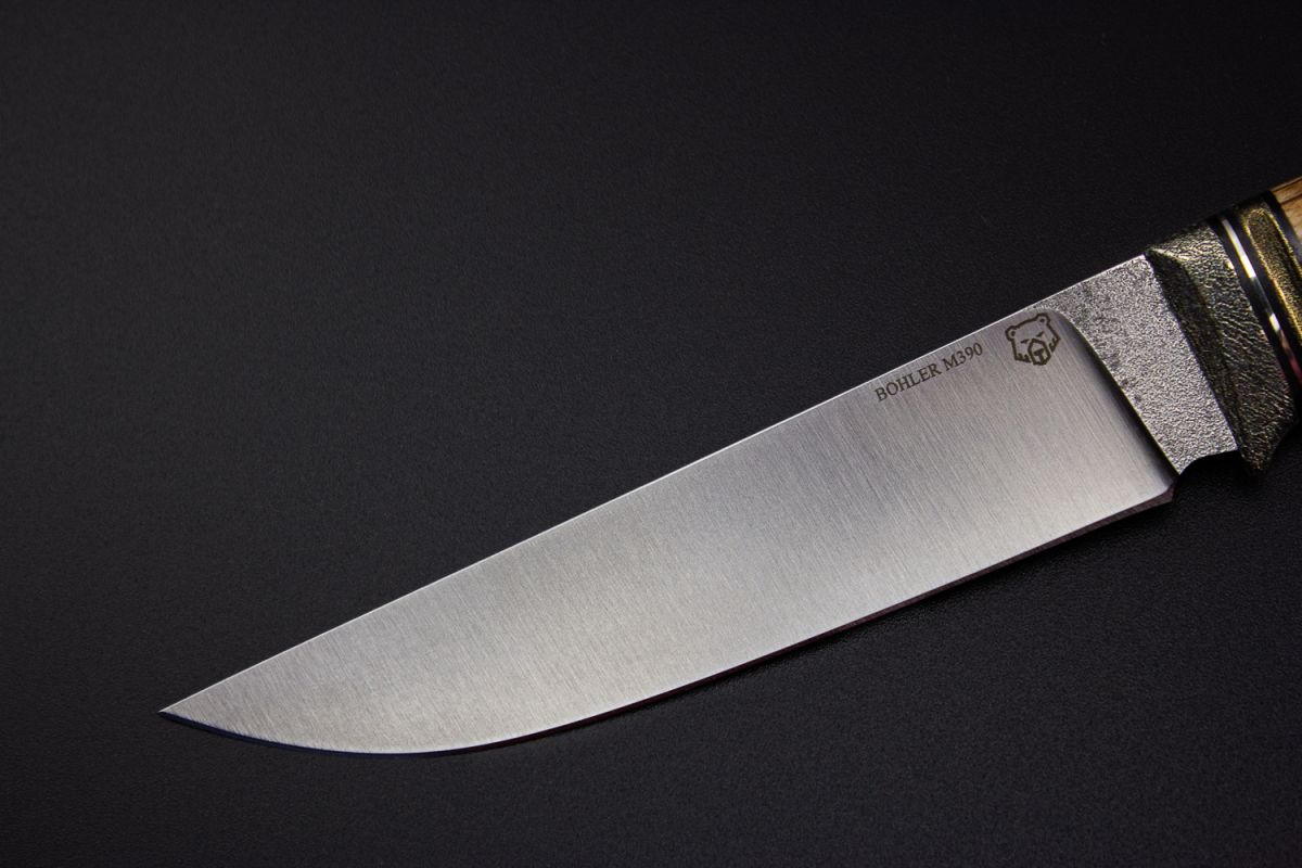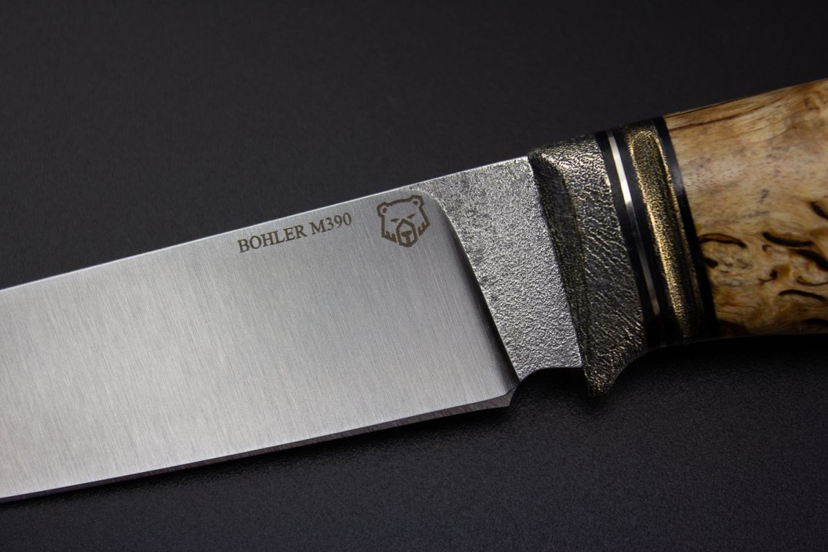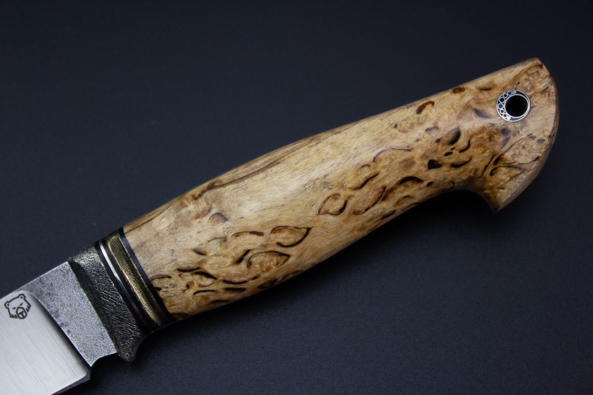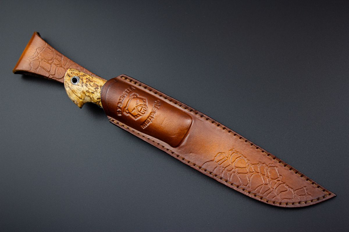 Нож Барс (М390, стабилизированная карельская берёза, литьё из бронзы с эффектом патины, мозаичный пин под темляк, формованные ножны)