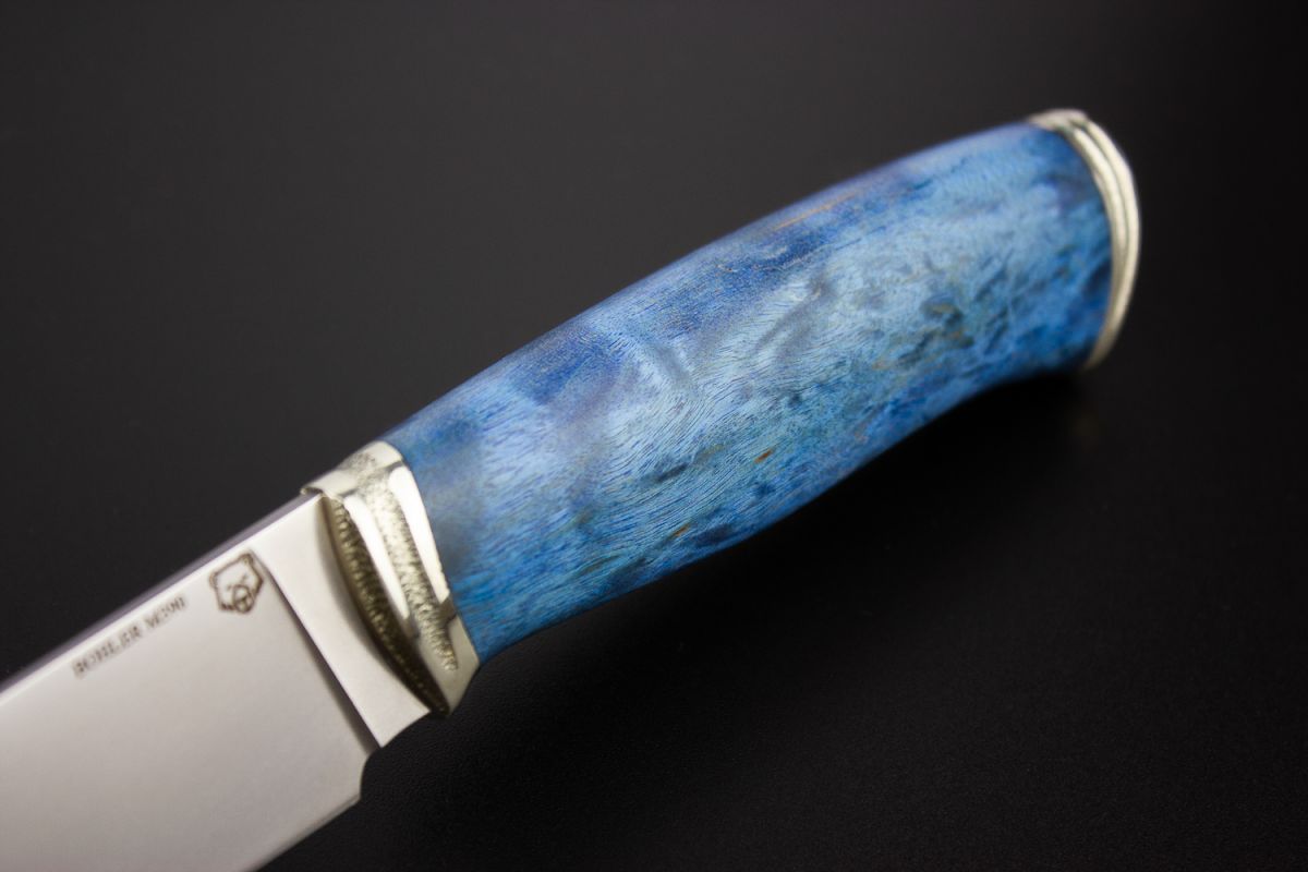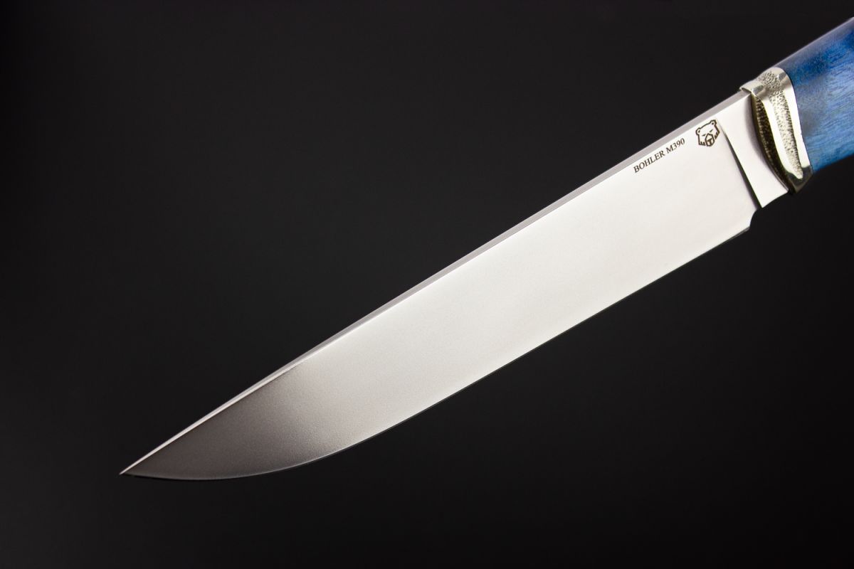 Нож Охотник 2 (М390, спуски от обуха, стабилизированная карельская береза, литьё мельхиор)