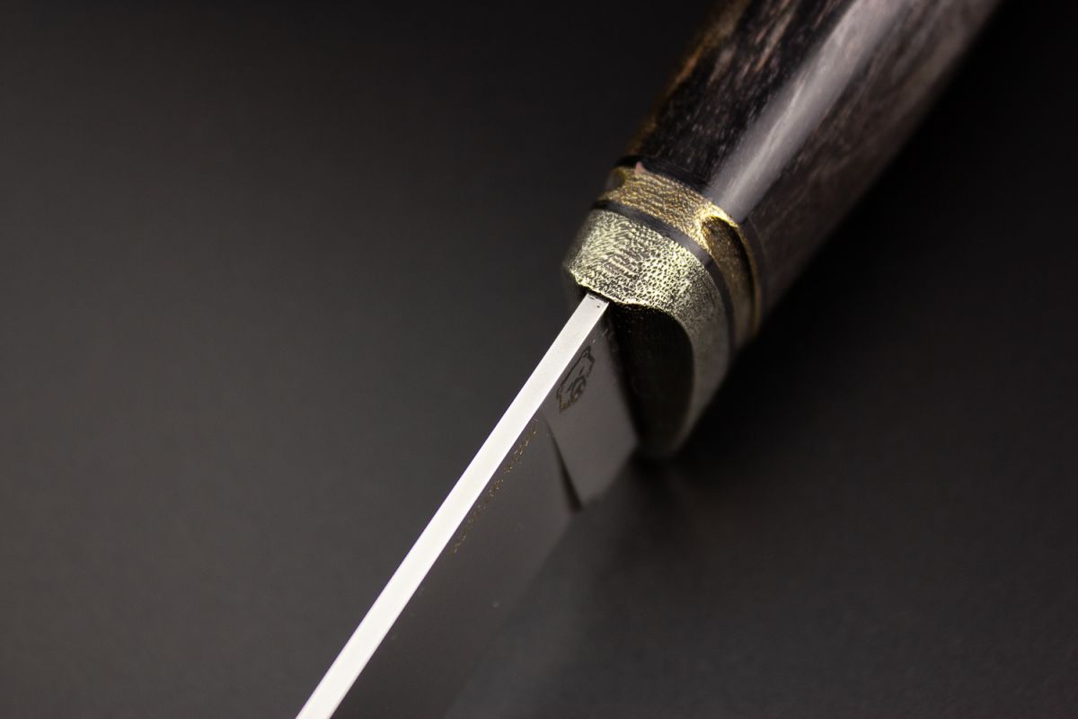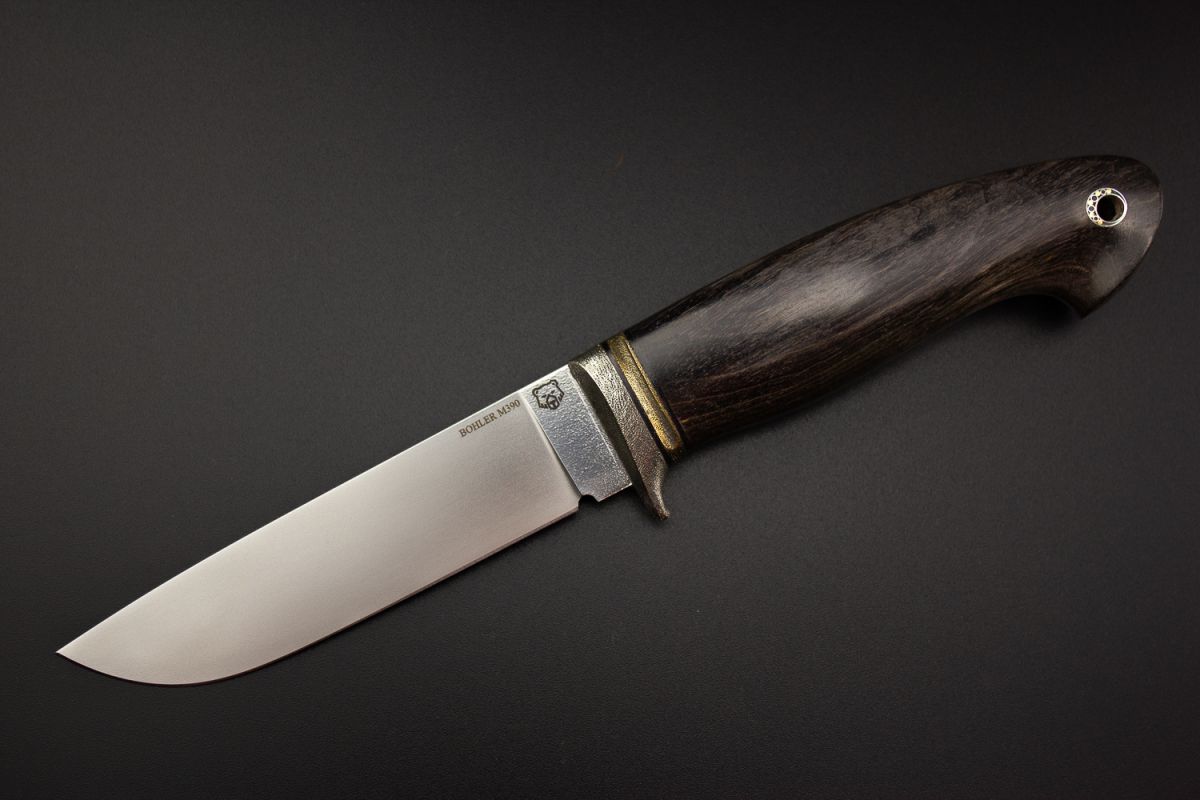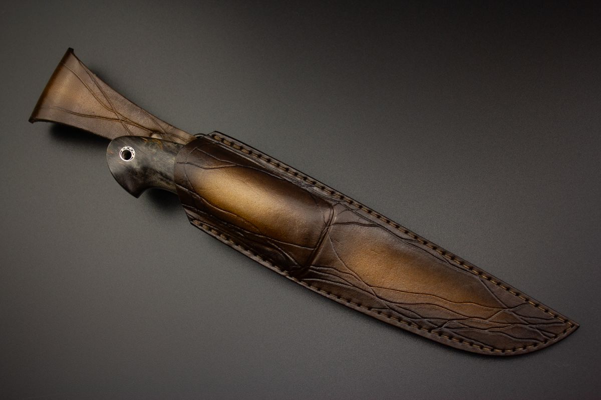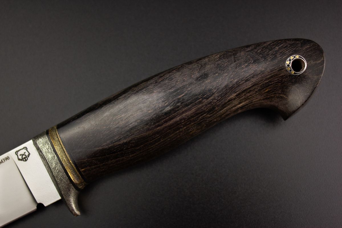 Нож Велес (М390, стабилизированная карельская берёза, литьё из бронзы с эффектом патины, мозаичный пин под темляк, формованные ножны)