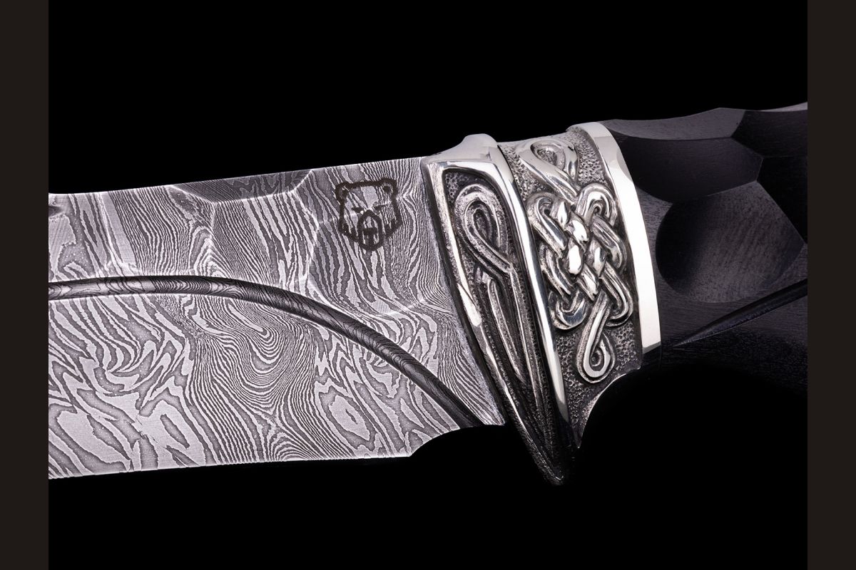 Нож Кайман (дамаск, долы - камень, чёрный граб, литьё мельхиор, резная рукоять)