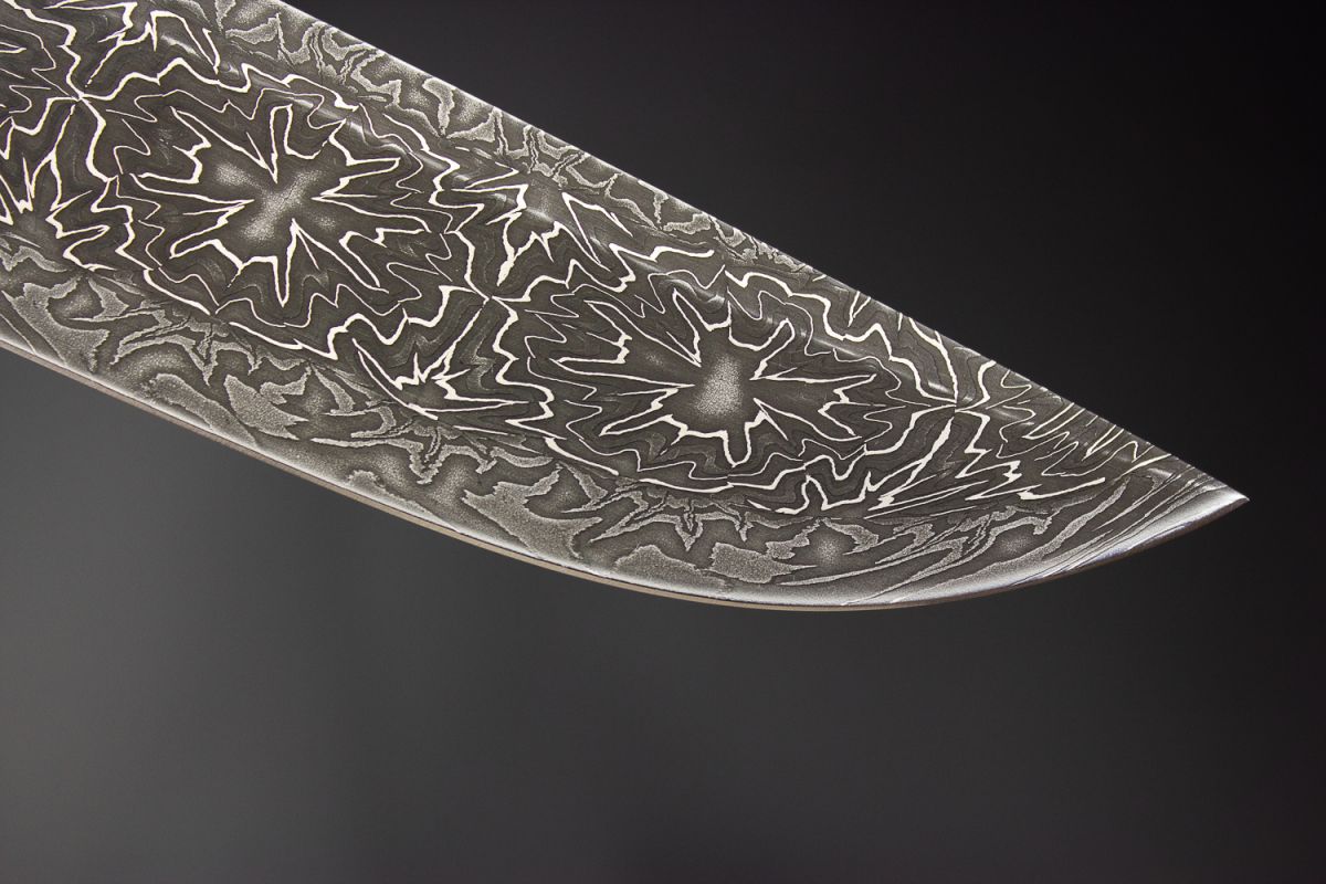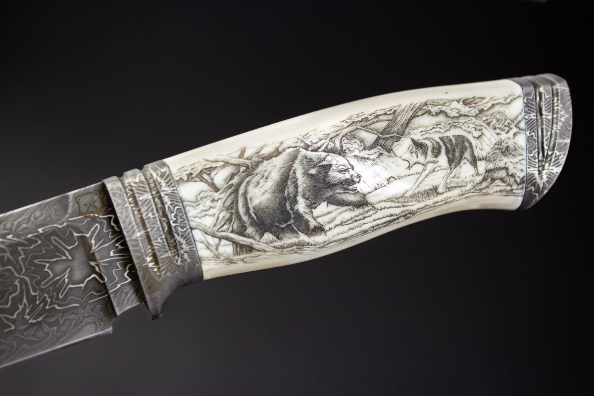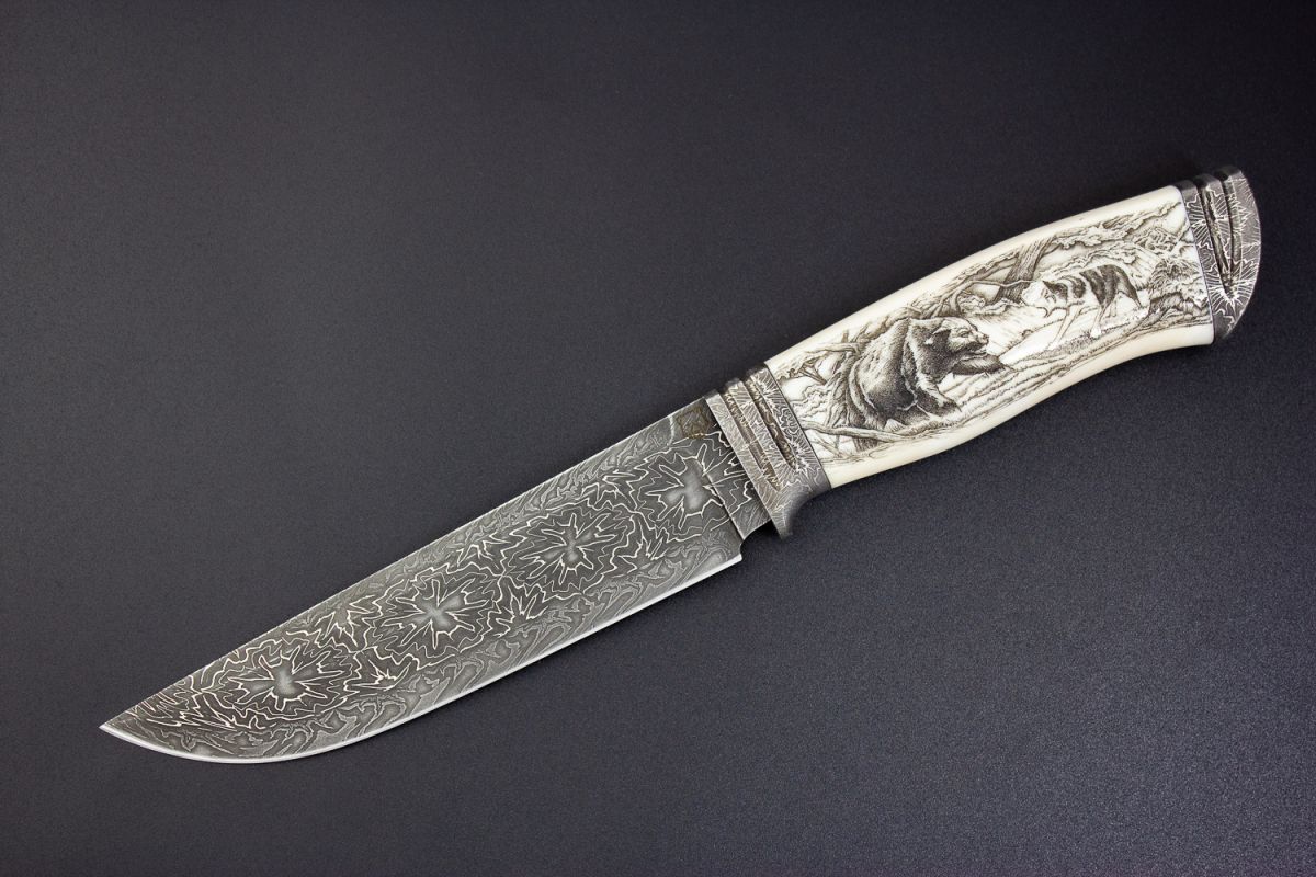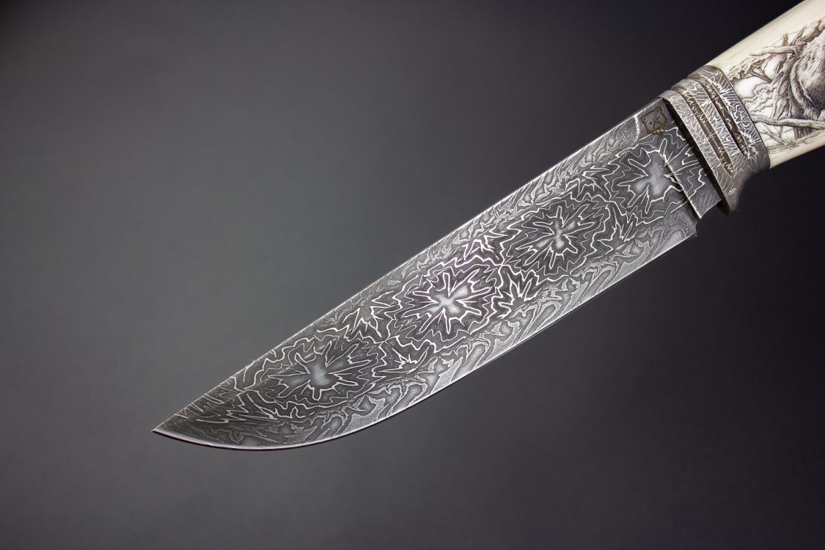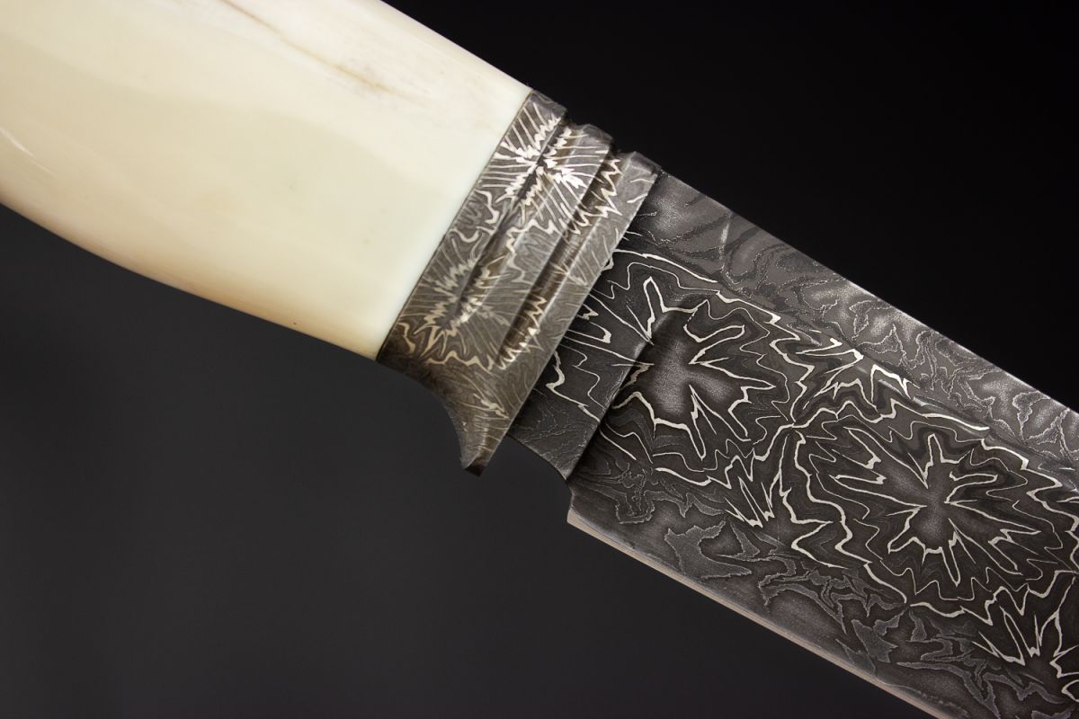 Авторский нож Походный 3 (Мозаичный дамаск, в режущей кромке 20000 слоёв, клык моржа, мозаичный дамаск, художественное оформление рукояти - скримшоу)